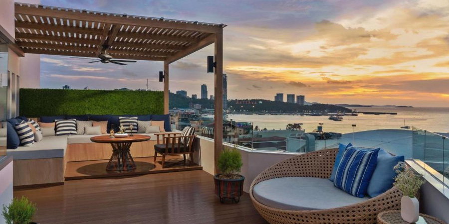 ジョムティエンの中でも特に「静かで安全」と評判のエリアにあるリゾートホテル。バルコニー付き客室と屋外喫煙スペースがあり、匂いトラブルを起こしにくい動線が取りやすいのがポイント。周辺にはコンビニやローカル食堂が多く、吸ったあとに軽くご飯を食べたり、ビーチをフラっと散歩したりと、のんびり過ごしたい人向けです。